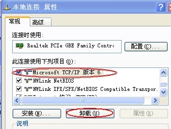 找到 “Microsoft TCP/IP 版本 6”并点击它,然后点“卸载”。