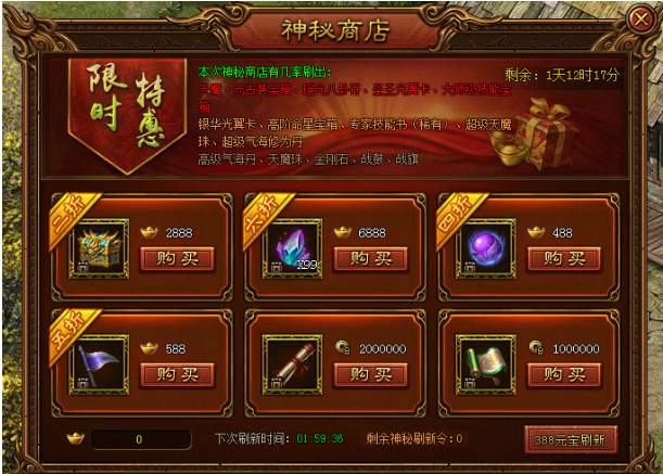 【活动内容】:活动期间神秘商店会刷新稀有道具,CD时间为2小时,可消耗388元宝进行刷新。