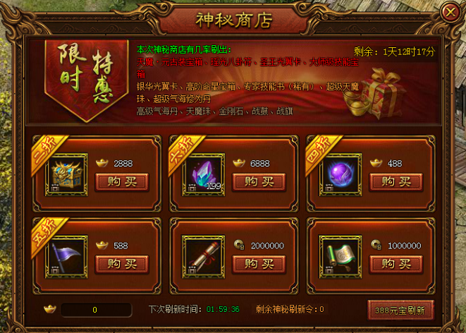 【活动内容】:活动期间神秘商店会刷新稀有道具,CD时间为2小时,可消耗388元宝进行刷新。