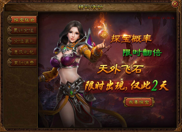 【活动内容】:活动期间内,探宝获得极品道具概率翻倍,海量装备随心获取!更有机会获得天外飞石!