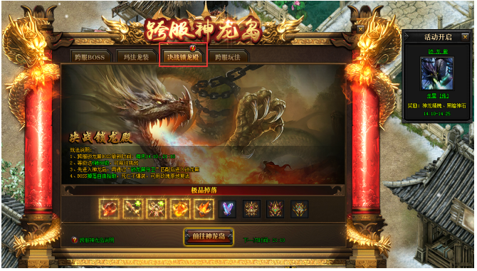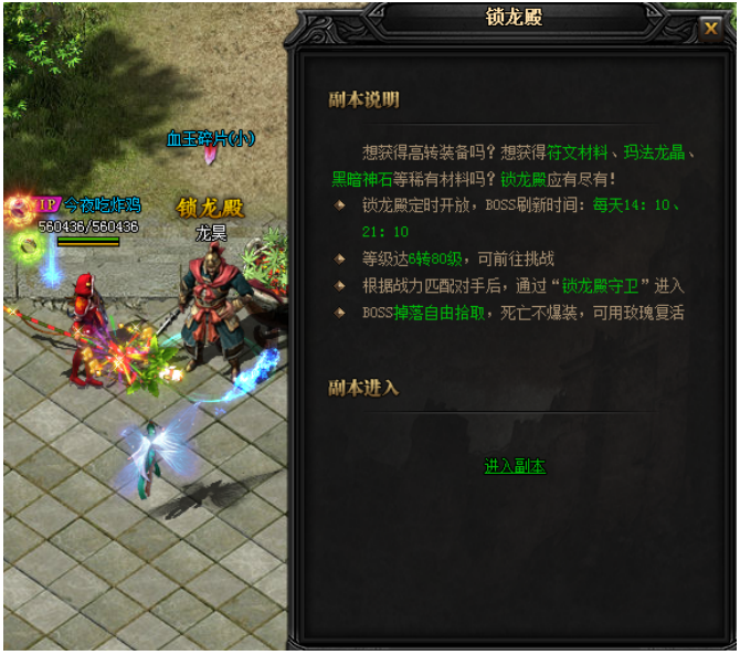 当角色达到6转80级,即可前往神龙岛,在“锁龙殿”开启时间内通过位于神龙岛安全区的npc“龙昊”(98,109)进入挑战
