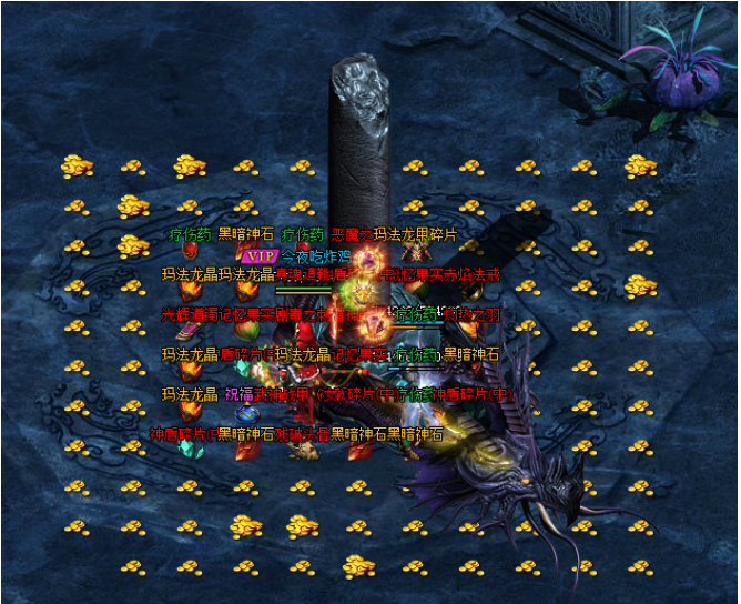 BOSS无归属判定,击杀后将掉落大量玛法龙晶、黑暗神石等超稀有材料,可自由拾取