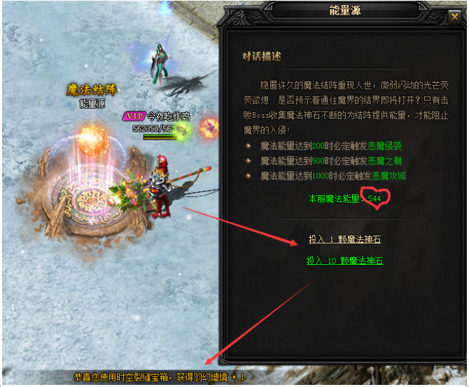 投放成功后,将随机获得相应数量的时空裂缝副本石头,同时累计本服魔法结阵当前的魔法能量值。