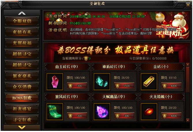 在特殊活动期间,将开放“BOSS狂欢”活动,活动期间,击杀BOSS可获得“BOSS积分”“BOSS积分”可在活动面板兑换材料,每种材料均有兑换次数限制
