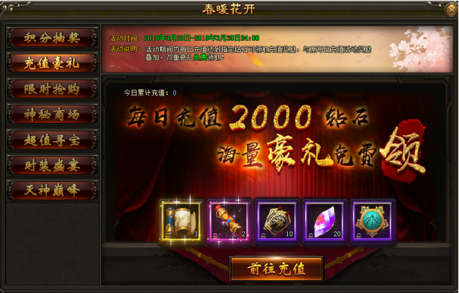 2.活动期间内,每日充值达指定钻石数额,即可领取充值奖励,可原每日充值奖励叠加领取。