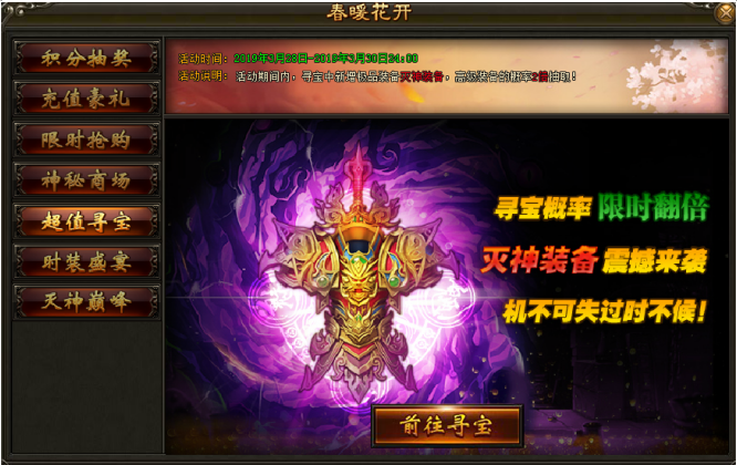 1.活动期间,王之宝藏可抽取灭神装备!高级装备概率翻倍!活动限时3天,机不可失过时不候