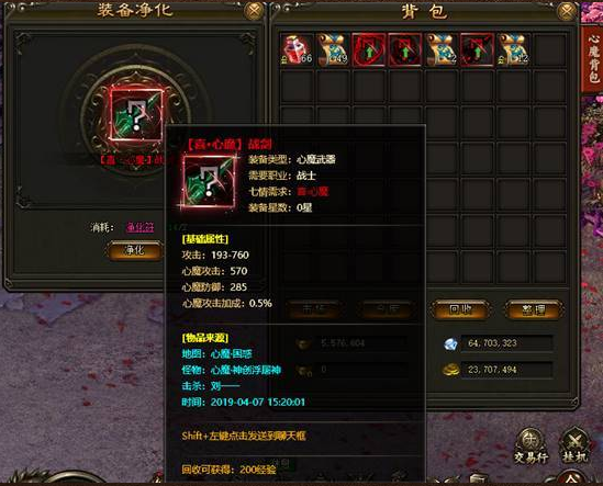 同时,在心魔地图里获取的装备,由于受到心魔瘴气的影响,只有一点点可怜的属性,此时需要玩家们将装备带给心魔村的长老进行净化后,才会展现它原有的实力。心魔装备净化后,还会随机出现装备星级,从1~~10星。是欧还是酋,可以找心魔村长老净化一下装备测试测试。