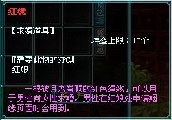 | 红线 | 男方角色用于“申请姻缘”(求婚) | 商城购买 | 50元宝 |