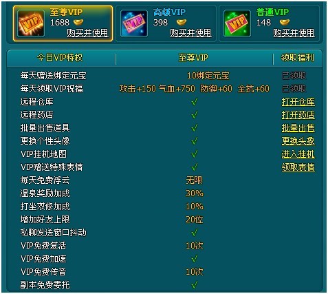 大家若是尊贵的VIP玩家的话,自然是好处多多啦,每天登录还有额外的绑定元宝返还。打开VIP面板,即可领取奖励!