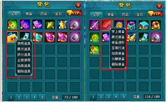 A区:背包分为5类,全部、装备、药品、宝石、VIP功能