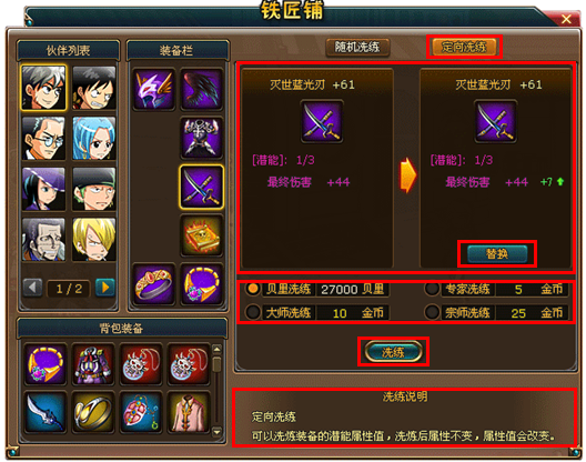(2)定向洗练:不改变当前装备属性的类型只改变属性的数值。