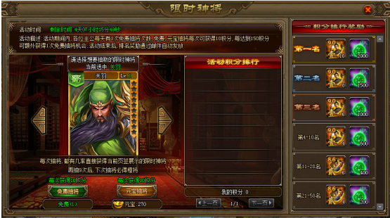 【活动内容】:活动期间,各位主公每天有一次免费抽奖次数。免费及元宝抽将每次可获得10积分,计算入积分排行帮,参与获得积分排行奖励,且每达到150积分可额外获得1次免费抽将的机会。(活动参考UI,具体以游戏中为主)