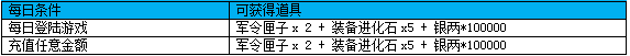 【活动内容】:感恩回馈,玩家每日登陆即可免费领一份福利礼包,同时每日充值任意金额,可再领一份福利礼包!