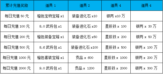 【活动内容】:活动期间,每日累计充值达到对应额度即可领取充值奖励!