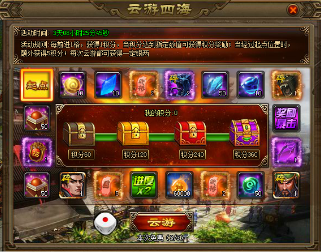 【活动内容】:活动期间,每消耗100元宝获得一次云游机会,玩家每前进一格,即可获得一个云游积分,积分达到一定数量,即可领取积分奖励,经过起点时候额外获得5积分奖励,每次云游都可获得固定的银两奖励!(活动参考UI,具体以游戏中为主)