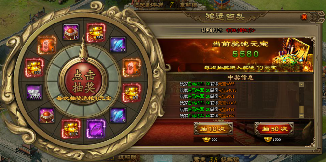 【活动内容】:活动期间,玩家每次抽奖消耗30元宝,每次抽奖将会有10元宝注入奖金池,玩家每次转动可以有机获得活动奖金池的10%奖金,25%奖金,50%奖金,100%奖金元宝。(活动参考UI,具体以游戏中为主)