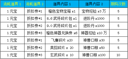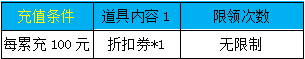 【活动内容】:活动期间,每累计充值满100元即可领取一张1折折扣券,使用折扣券1元宝购买超值奖励。