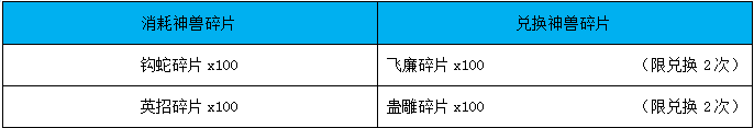 【活动内容】:活动期间,可使用指定神兽碎片兑换对应神兽碎片!