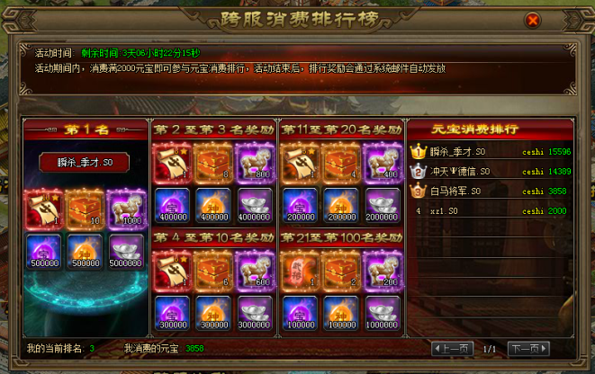 【活动内容】:活动期间,玩家消费满2000元宝,便可参加元宝消耗排行榜。活动结束后排行榜奖励将会通过系统邮件自动发放。(活动参考UI,具体以游戏中为主)