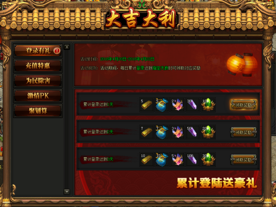 【活动规则】:活动期间,每日累计登录到达指定天数时可领取对应奖励!