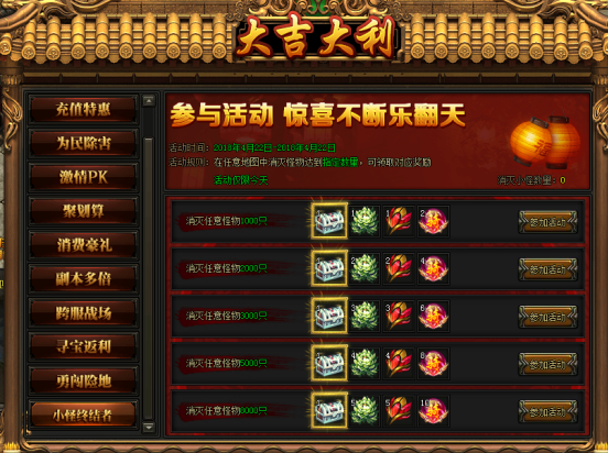 【活动规则】:在规定地图中消灭怪物达到指定数量,可领取对应奖励,活动仅限活动时间当天
