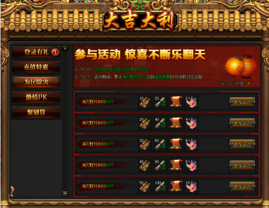 【活动规则】:活动期间,累计消灭野外BOSS达到指定数额时可领取对应奖励