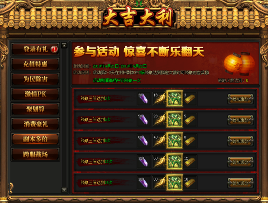 【活动规则】:活动第2-3天在材料副本中3倍领取达到指定次数时可领取对应奖励,活动期间每档只可领取一次