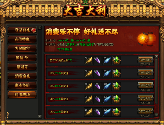 【活动规则】:参加指定跨服活动并满足对应需求时可领取对应奖励,次日凌晨重置