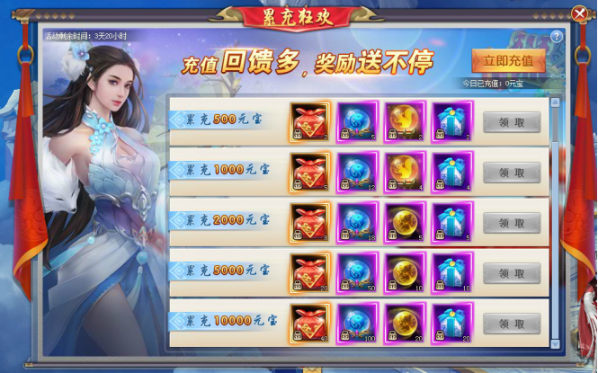 【活动内容】:活动时间内,充值达到指定数额,即可获得丰厚的充值大礼一份,海量福利等你拿!