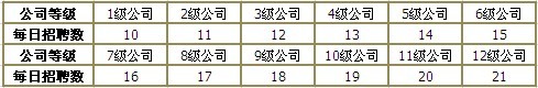 每天招聘员工的总次数是有上限的,公司等级越高,招聘次数越多。