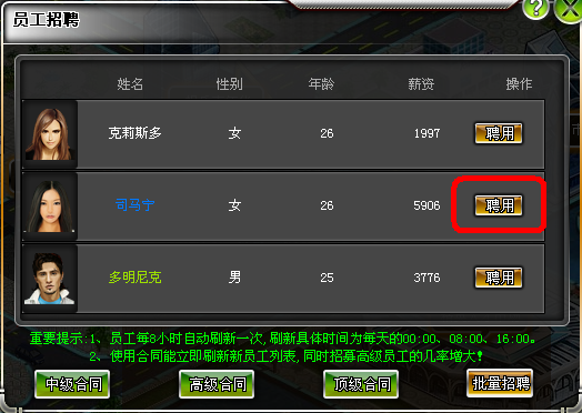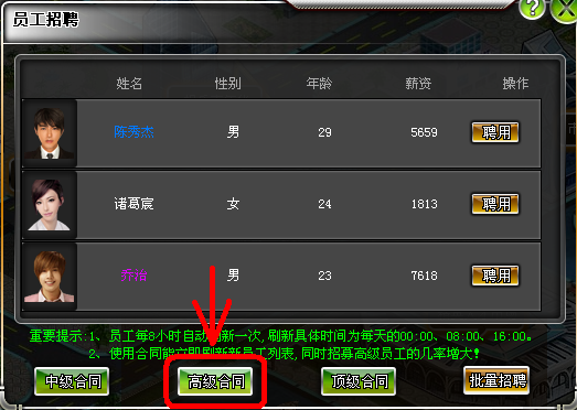 使用合同能立即刷新员工列表,同时招募高级员工的几率增大。