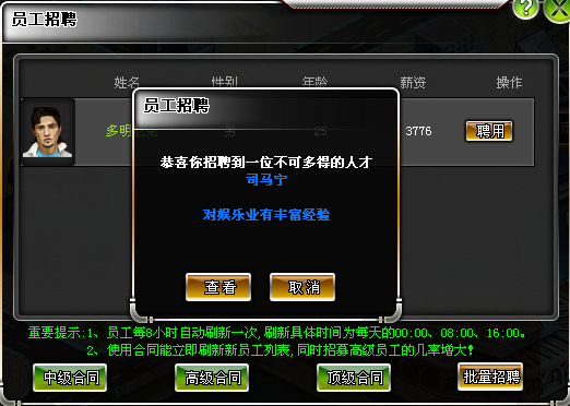 选择后确定聘用,即可招聘到一位员工!如果您觉得麻烦,也可以点击“批量招聘”按钮,非常方便。