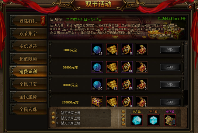【活动说明】:活动期间累计消费达到对应额度即可领取丰厚奖励,达到一定金额更可参与排行竞技夺取诸神装备等大奖!
