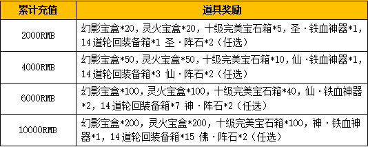 【活动内容】:活动期间,累计充值达到对应要求即可获得超值奖励,幻影宝盒、灵火宝盒、十级完美宝石箱、神·铁血神器、14道轮回装备箱,阵石等超值奖励大赠送.