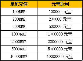 【活动内容】:活动期间,单服前20名玩家单日单笔充值达到对应要求即可获得100%的元宝返利,活动仅限2天!