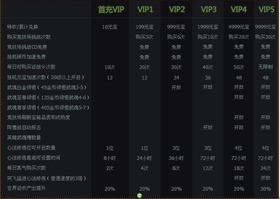 虽然每个人都可以用银币领悟武魂。但随机性的武魂领悟也让人多了些许无奈,有时可能领悟了10次也未必能合到自己想要的。充值成为VIP2以上玩家就能享受武魂白金领悟功能,可直接领悟3~5重的武魂。成为VIP4以上的玩家后,更可享受到武魂至尊领悟功能,直接领悟4~6重的高阶武魂。如果有想要省事直接领悟到7重武魂的玩家,也可以直接充值成为VIP6以上用户体验武魂尊享领悟功能,获得7重武魂不再是难事也不会费时费钱。