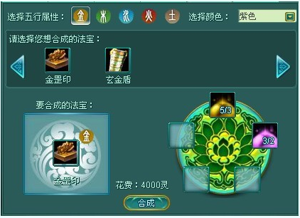 法宝分为金,木,水,土,火五类法宝,不同五行属性的法宝会携带不同的法宝技能。