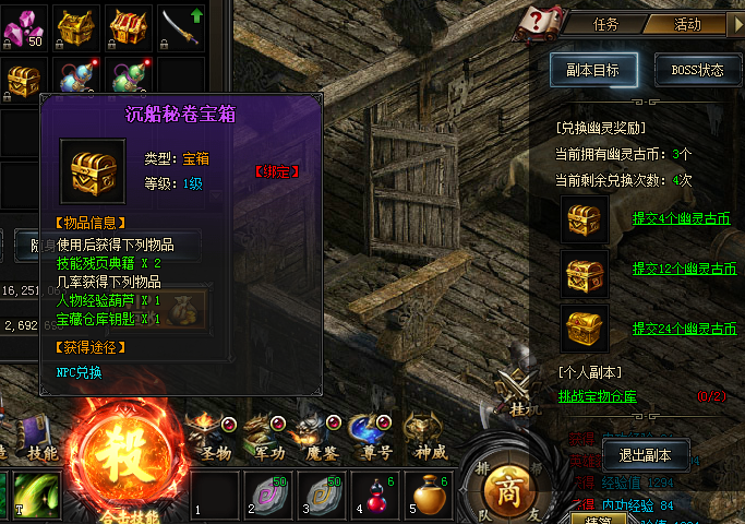 幽灵船内分有幽灵船入口、船舱下层、船舱上层,里面有大量的小怪,击杀可掉落沉船古币,用来兑换技能残页典籍提升技能等级。