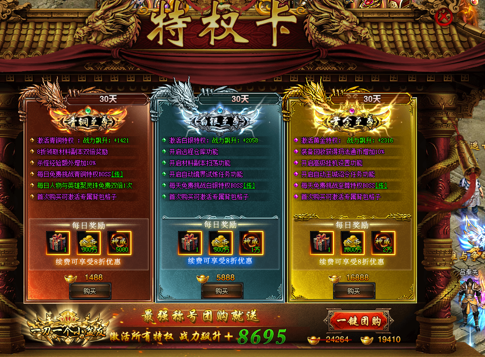 每种特权卡都有不同的专属特权及每日奖励,还有攻击加成称号,效果均可叠加。