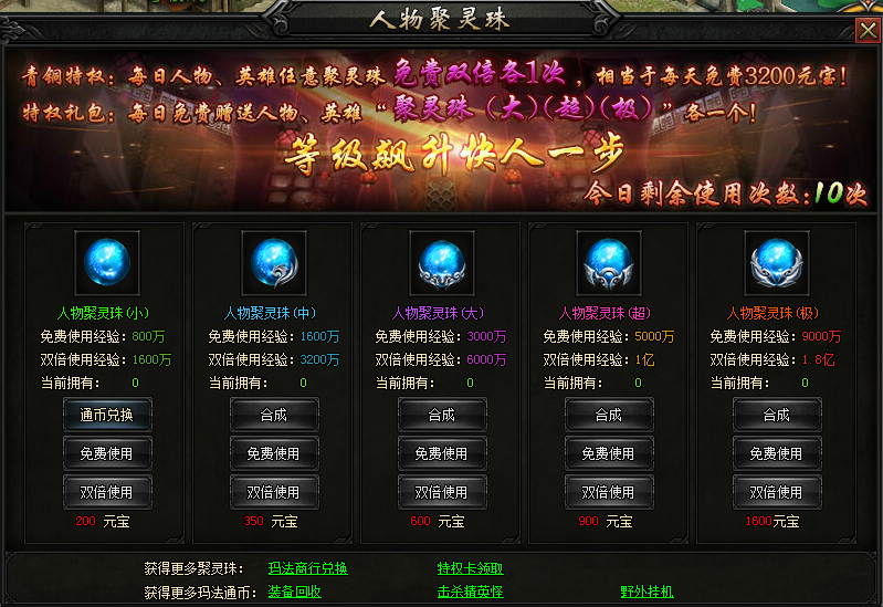 玩家每天可以使用人物聚灵珠、英雄聚灵珠各10次,所以尽可能的使用更高级的聚灵珠,会有不同的收获哦。