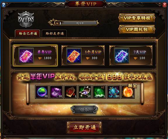 一次性开通半年VIP可成为紫金VIP,紫金VIP成长值3点/天;并可领取紫金VIP专属价值1988豪华大礼包