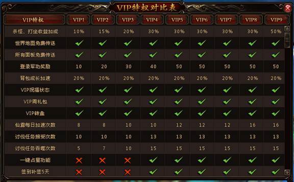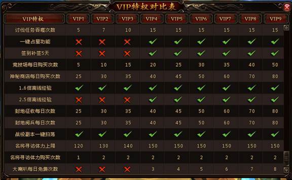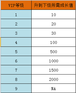 当玩家消费1元宝则增加1点成长值,当玩家成长值达到一定值时,则VIP等级升级。VIP等级与成长值对应表: