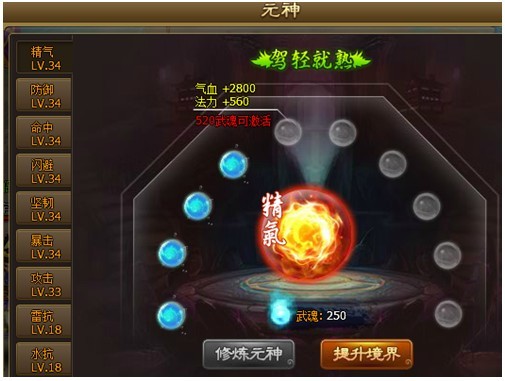升级元神。元神升级可得大量属性加成,升级需要武魂,武魂可去剧情地图封魔录打怪获得(封魔录在界面右上角)。VIP玩家可免费迅速冷却。